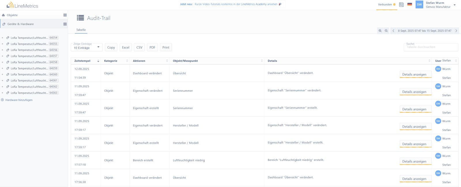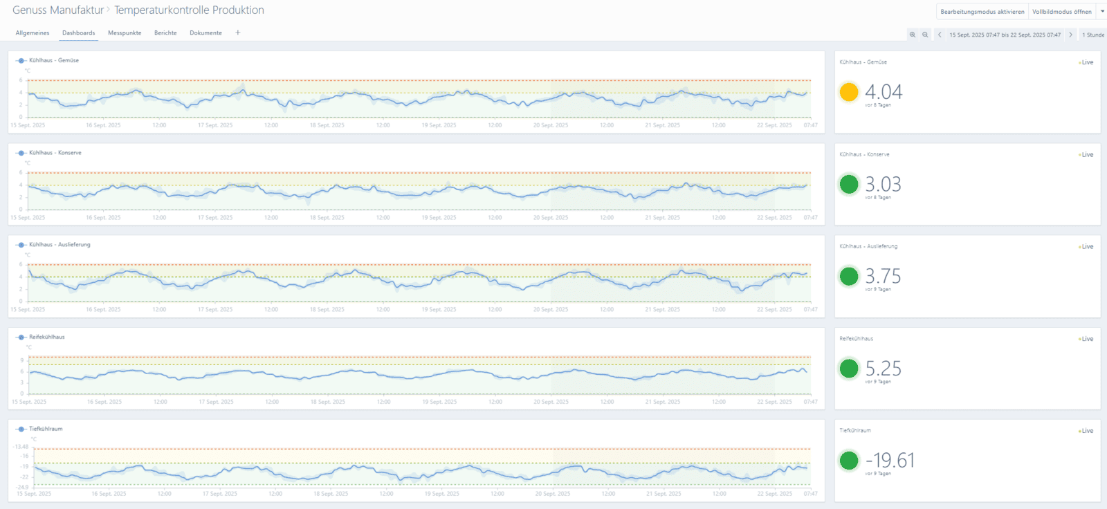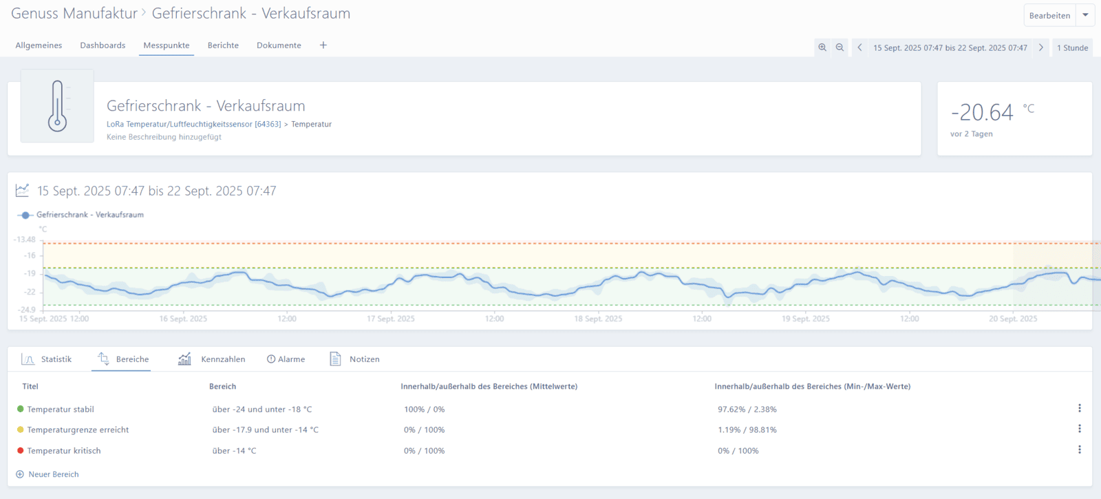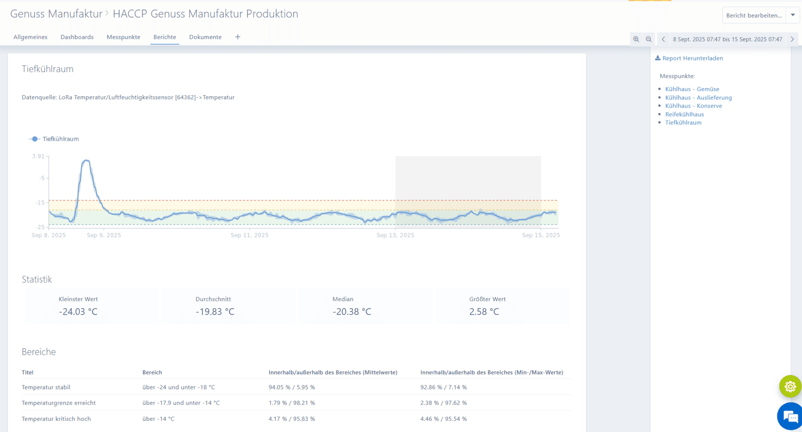 Alle Temperaturwerte werden automatisch aufgezeichnet und revisionssicher gespeichert. Zusätzlich führt das System einen vollständigen Audit Trail über alle Änderungen, die von den Nutzern vorgenommen werden. Mit nur einem Klick können Sie fertige HACCP- oder IFS-Reports herunterladen, die alle Anforderungen der Lebensmittelkontrolle erfüllen. Damit sparen Sie wertvolle Zeit in der Dokumentation und können bei Audits oder Kontrollen jederzeit lückenlose und nachvollziehbare Nachweise vorlegen.